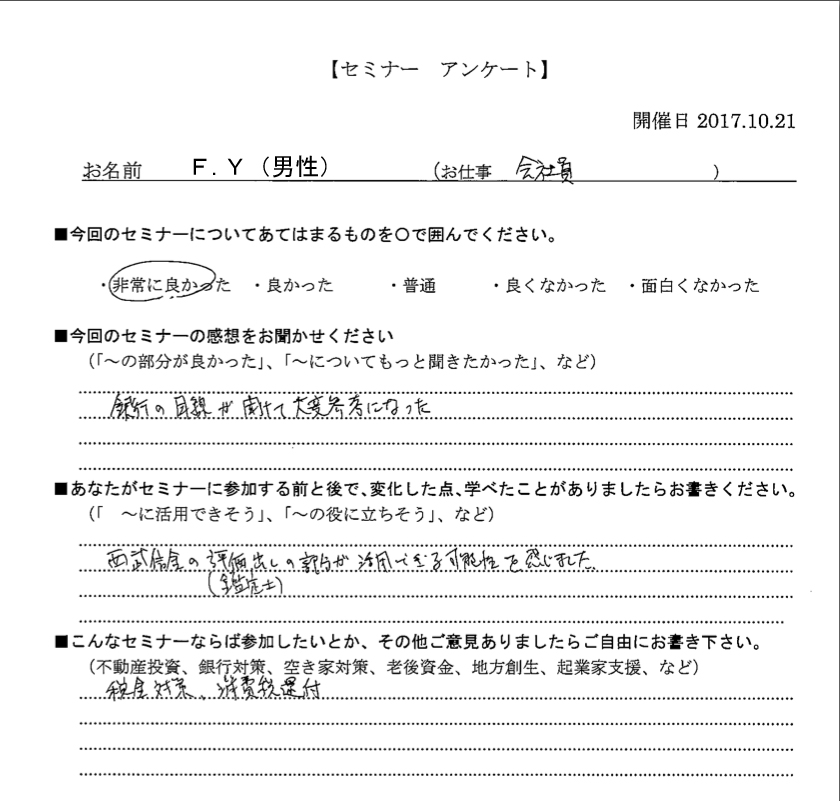 続きを読む →2017年10月21日に行われた「不動産投資セミナー」の参加者の声です。