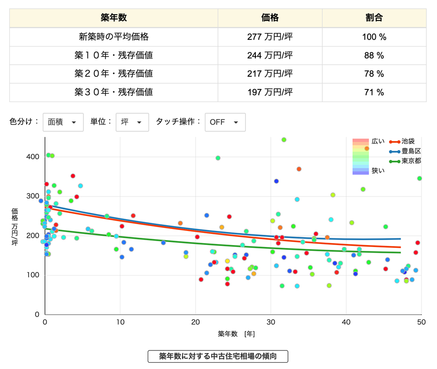 このデータを参考にすることで、マンションなどの築年数に応じた物件価格推移の予測が可能になるのです。